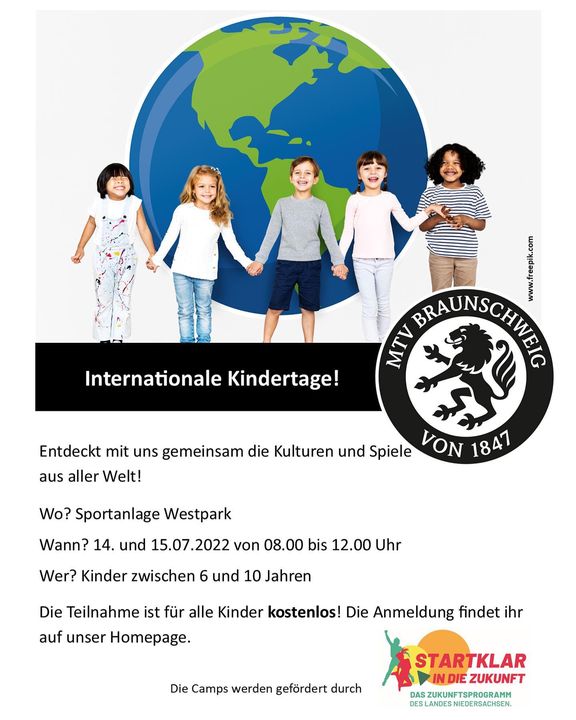 In dem Zeitraum vom 14.07.-15.07.2022 von jeweils 8:00-12:00 Uhr bieten wir allen Kindern, im Alter von 6 bis 10 Jahren einen internationalen Kindertag! Gemeinsam entdecken wir die Vielfalt unserer Welt, lernen neue Kulturen kennen und testen spannende Spiele!🤩