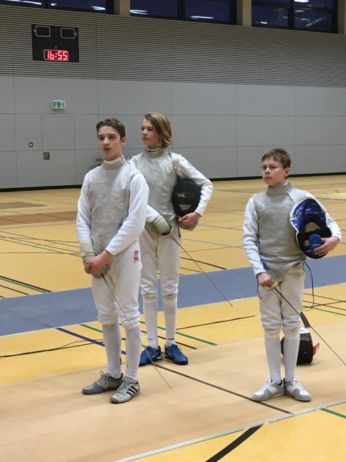 Bei den U-15-ern traten Benjamin Schmitz und Victor Vollbrecht zusammen mit Campino Meier-Eckhoff vom TK Hannover an und verteidigten ihren überraschenden Titel vom Vorjahr erfolgreich. Nach dem Einzelwettbewerb war das Trio an Platz Drei gesetzt. Im Halbfinale gegen die an Nr. Zwei gesetzte Startgemeinschaft Eintracht Hildesheim/Frisia Wilhelmshaven gelang ein deutlicher 45:31-Sieg. Das Finale gegen die Startgemeinschaft SV Alfeld/TSV Winsen war spannender, schließlich waren in dieser Mannschaft der Zweite, der Dritte und Sechste der Einzelmeisterschaft vertreten. Bis zum drittletzten Gefecht gab es wechselnde Führungen. Dann legte Campino sieben Treffer vor. Benjamin und Victor verteidigten diesen Vorsprung mit cleverer Taktik und sicherten den 45:38-Sieg. Im Einzelwettbewerb wurde Benjamin Schmitz Dritter und wahrte damit seine guten Chancen für die DM-Qualifikation. Victor Vollbrecht belegte nach verlorenem Achtelfinale Platz Neun.